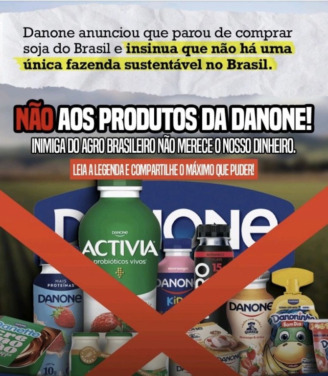 Em suas redes sociais, o presidente do Instituto do Agronegócio (IA), Isan Rezende, apoio uma proposta de campanha contra os produtores Danone no Brasil. “Campanha contra os produtos Danone: a fracesa Danone divulgou que não há uma única fazenda sustentável no Brasil, por isso não compra mais soja brasileira. A empresa escreveu: “…só levamos ingredientes sustentáveis conosco, a Danone não está mais exposta ao desmatamento como estão as suas concorrentes”.