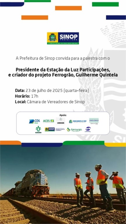 A Prefeitura de Sinop, por meio da Secretaria de Desenvolvimento Econômico, promove, hoje (23), a palestra com o criador do projeto da Ferrogrão, Guilherme Quintella, para atualização do projeto original. O evento é aberto ao público e será às 17h, no plenário Jorge Abreu, da Câmara Municipal de Vereadores, localizada na avenida das Figueiras, nº 1.835, Centro.