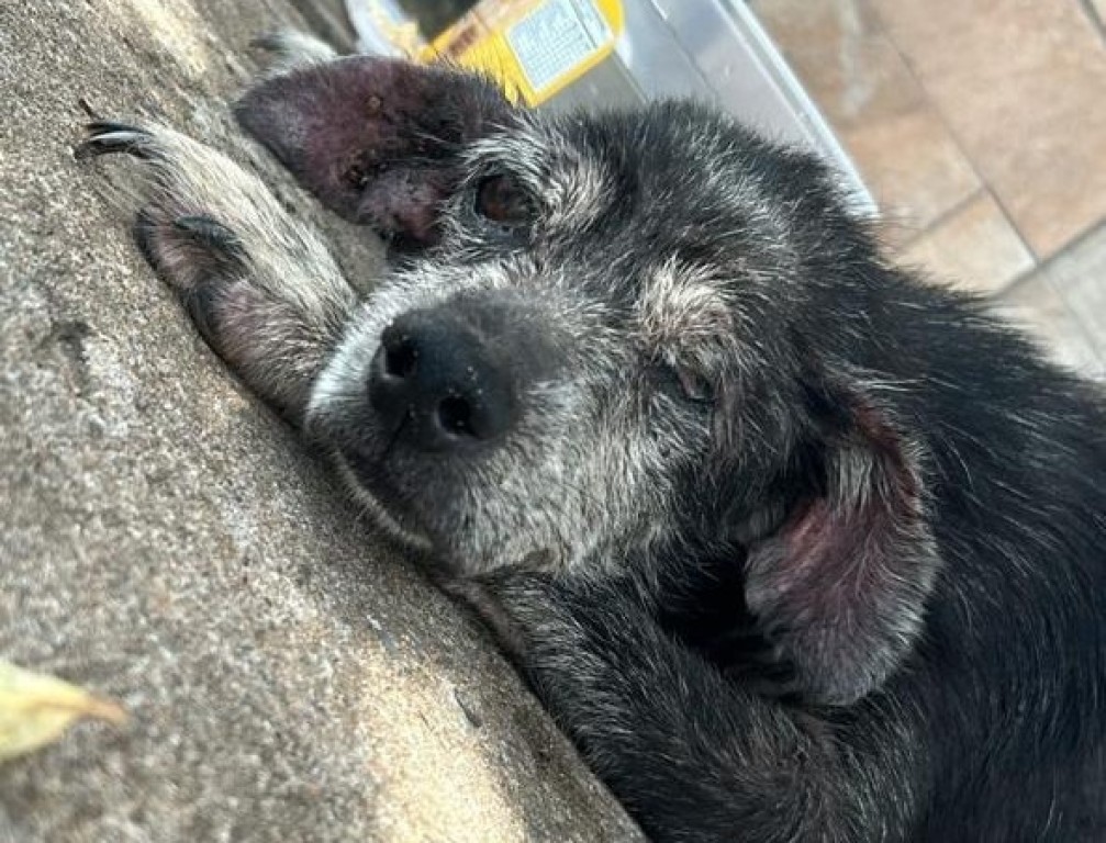A imagem mostra um animal canino deitado ao chão em estado de abandono, desnutrido, vítima de maus-tratos. Ele foi resgatado pela Prefeitura de Cuiabá, através das equipes que atuam na Bem-Estar-Animal.