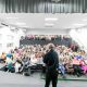 A foto ilustra o secretário de Educação de Cuiabá, Amauri Monge Fernandes, vestido com traje social em um palco de auditório. É possível visualizar servidores da educação sentados em cadeiras almofadadas, atentos à fala do secretário.