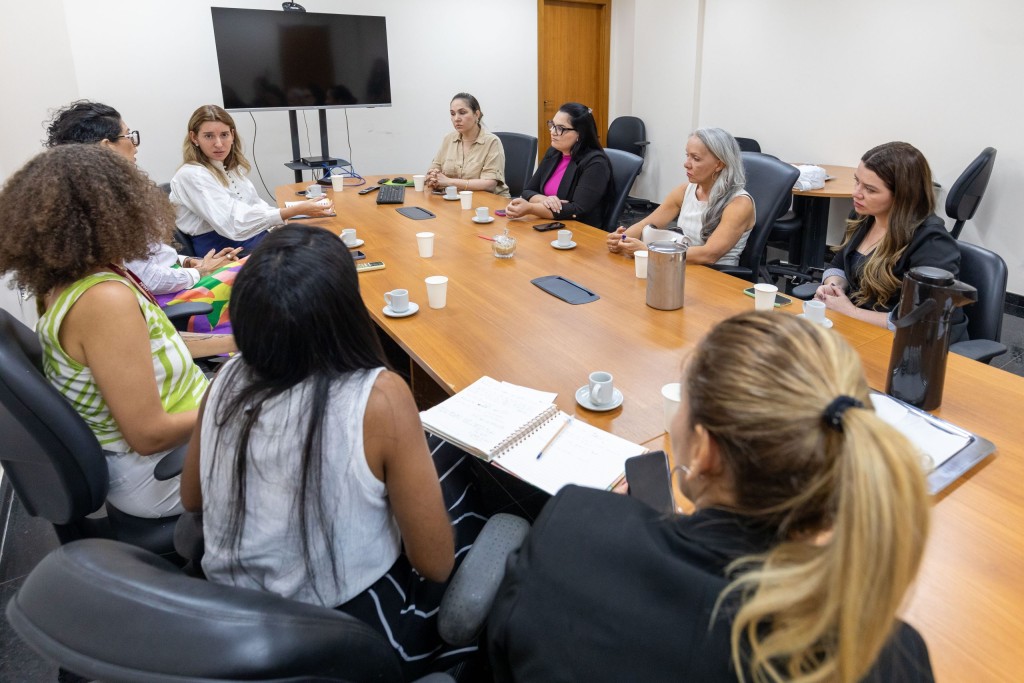 A foto mostra as secretárias da Mulher e da Saúde de Cuiabá, Hadassah Suzannah e Lúcia Helena, respectivamente, além da primeira-dama e vereadora Samantha Iris, reunidas com a promotora de Justiça Claire Vogel Dutra e sua equipe. Todas estão sentados à mesa, em ambiente formal, discutindo soluções para garantir o acolhimento às mulheres vítimas de violência na capital.
