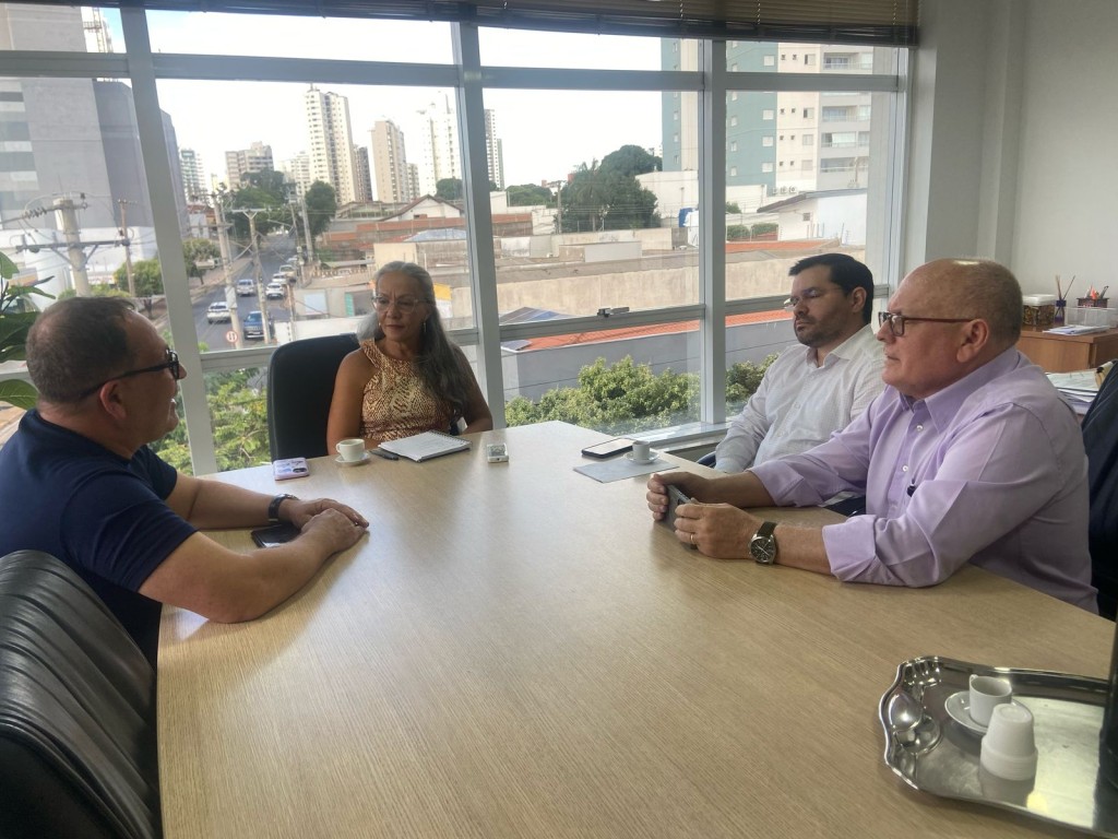 A imagem ilustra uma reunião entre a secretária de Saúde de Cuiabá e representantes do Sindicato dos Médicos de Cuiabá, além de outros representantes. Eles estão sentados em cadeiras pretas ao redor de uma grande mesa de madeira.