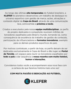 Apenas no Twitter, o perfil conta com mais de 650 mil seguidores, no Instagram eram mais de 1,5 milhão de seguidores. A empresa alegou motivos contratuais para deixar de gerir o perfil com o nome da Copa do Brasil. Confira o comunicado da empresa: