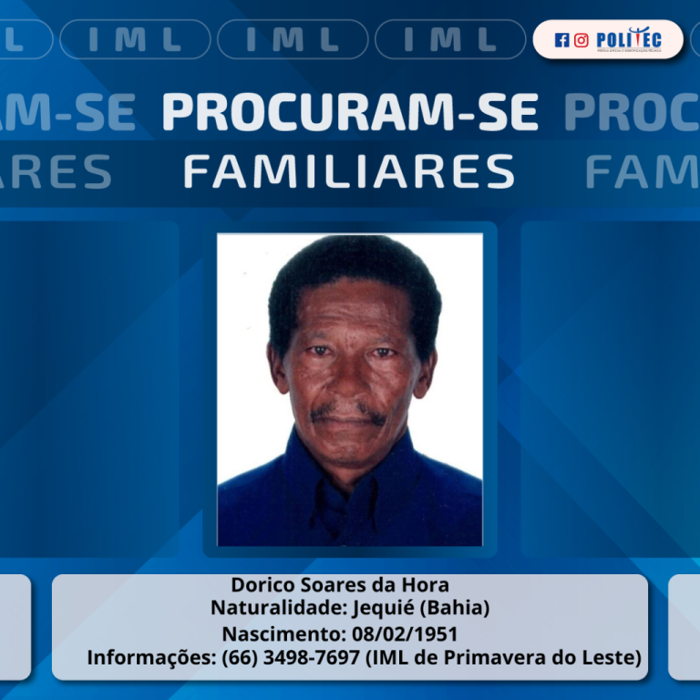 A Perícia Oficial e Identificação Técnica (Politec) procura por familiares de um homem identificado como Dorico Soares da Hora, de 73 anos. O corpo encontra-se na unidade de Primavera do Leste (a 234 quilômetros de Cuiabá) aguardando por liberação.