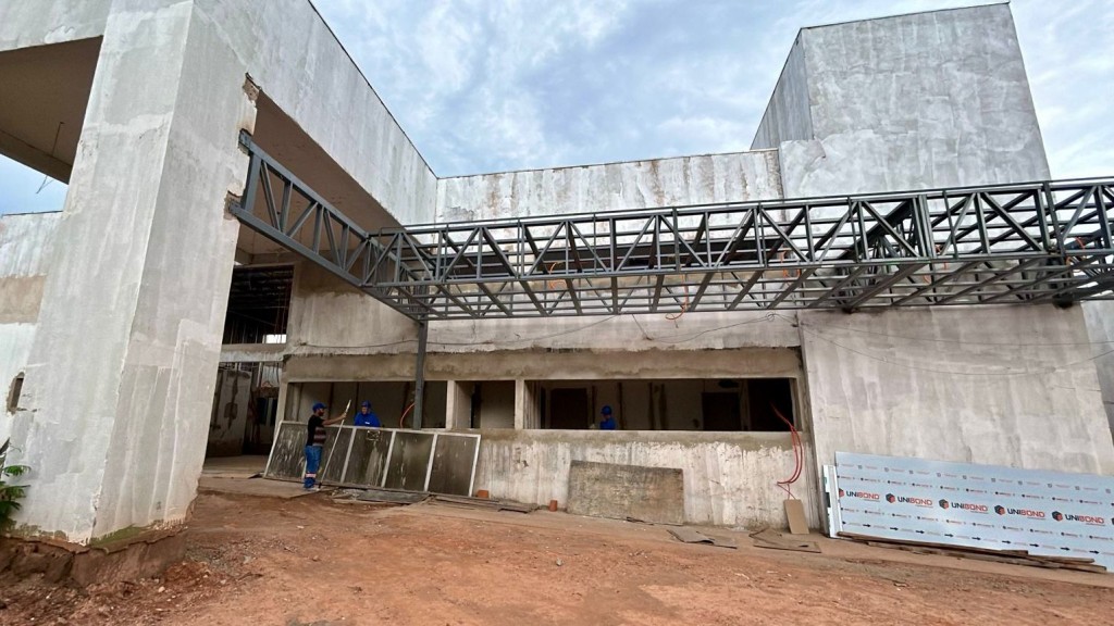 Na obra, já foram realizados o trabalho de regularização de base e terraplanagem, alvenaria de vedação, reboco, revestimento, execução de vigas baldrame, execução de sapatas, execução de pilares, execução de lajes, concretagem de piso armado, laje e pilares, instalação de telhas metálicas da cobertura, montagem de estrutura metálica (marquises e cobertura), pintura de perfis metálicos, instalação de eletrodutos, instalações hidráulicas e sanitárias, e drenagem de águas pluviais, drenos e calhas.