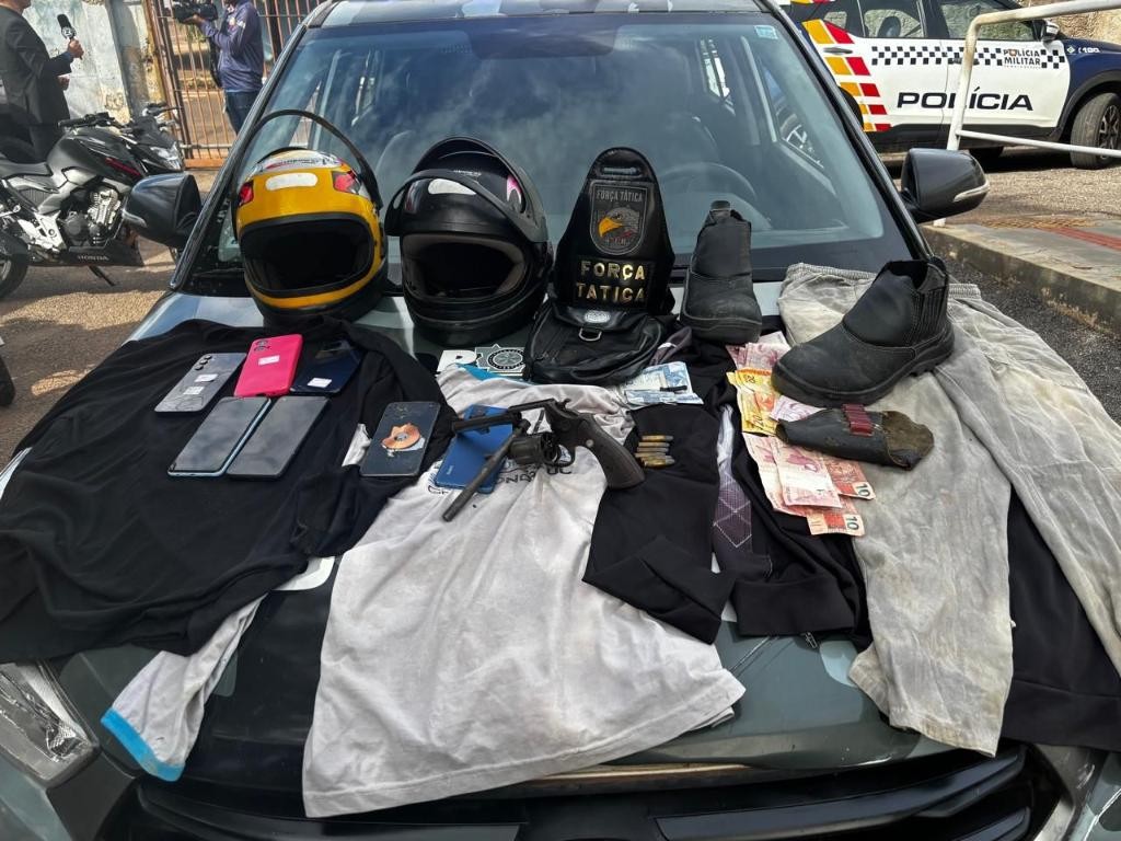 Após acompanhamento, os suspeitos vieram a colidir com a viatura da equipe policial e se renderam. Com eles, os policiais encontraram o valor roubado do estabelecimento e uma arma de fogo de calibre .38 com seis munições intactas, uma arma de fabricação artesanal e outros objetos utilizados no crime.