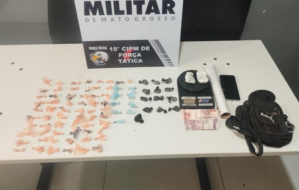 Ciente das características do suspeito, as equipes se deslocaram ao local e flagraram o homem, que correu para o fundo de uma casa e dispensou uma bolsa ao chão, sendo abordado e detido em seguida. No local, as equipes encontraram, ao todo, 84 porções de substância análogas à cocaína, um aparelho celular, uma balança de precisão e R$ 15.