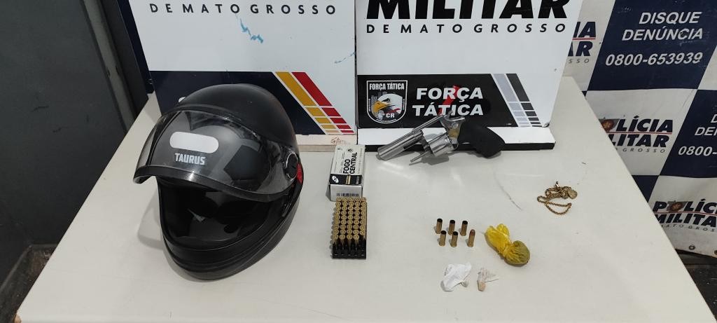 Os policiais se deslocaram até o endereço do homem e encontraram uma pistola de calibre 9 mm com 10 munições e um simulacro de pistola. Também foram apreendidas porções de entorpecentes e os suspeitos foram conduzidos para a delegacia de Pontes e Lacerda.