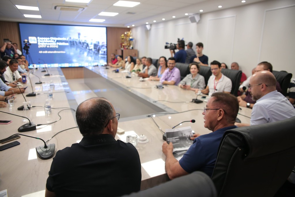 Durante explanação, apresentou números da gestão aos jornalistas. Sobre o grande Programa de Regularização Fundiária, informou que já destinou mais de R$ 5 milhões para impulsionar a entrega de mais 20 mil escrituras. Até o momento, 24 mil já foram concedidas a famílias das zonas urbana e rural e mais 20 mil já estão nos cartórios.